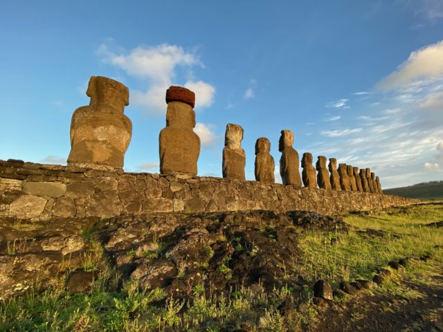 sunrise on hills shadows of moai in foreground