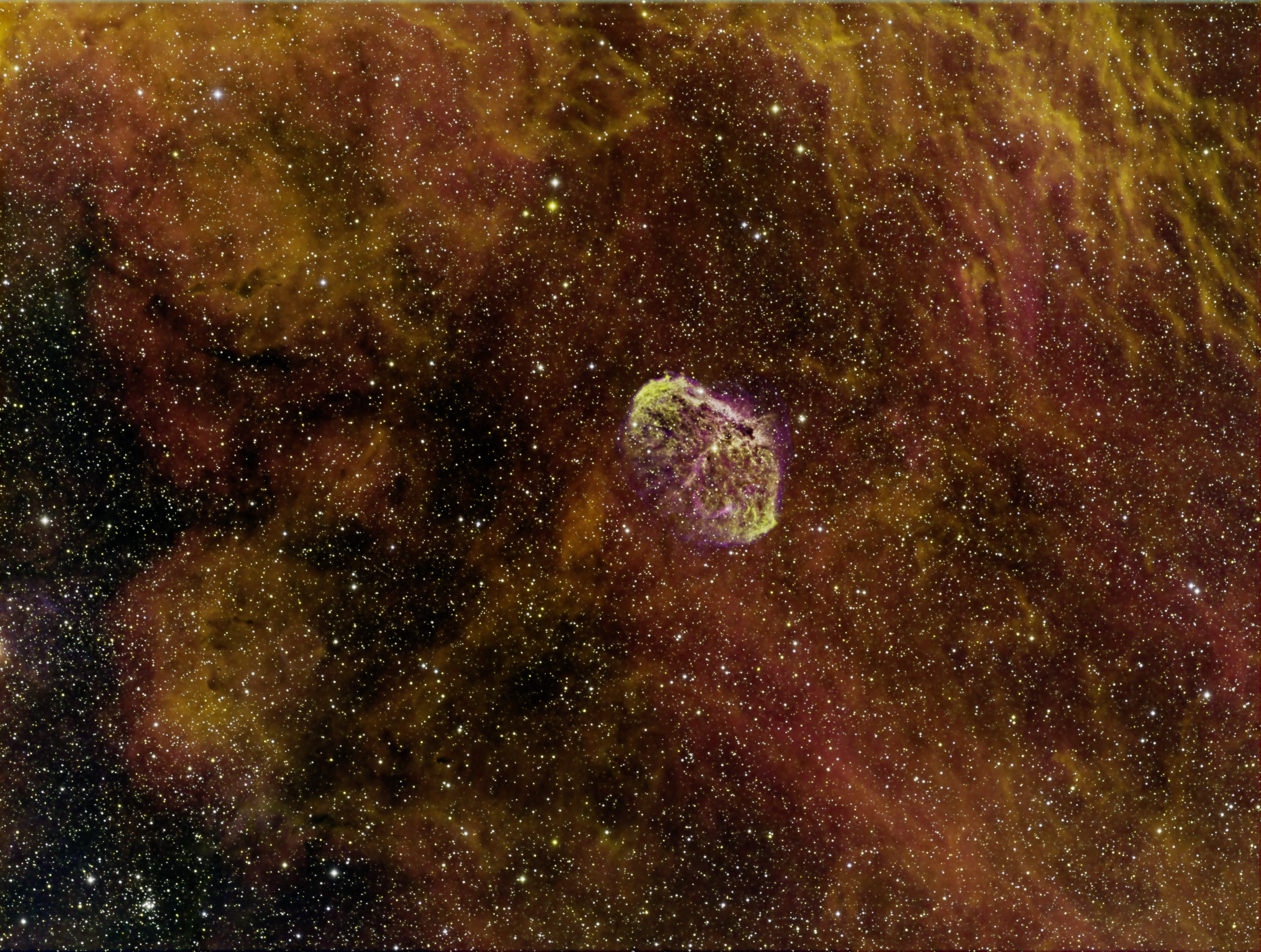 The Crescent Nebula was formed by a Wolf Rayet star WR 136 of type WN6. Wolf Rayet stars of this type represent the death of massive stars. The characteristic emission lines are formed in the extended and dense high-velocity wind region enveloping the very hot stellar photosphere, which produces a flood of UV radiation that causes fluorescence in the line-forming wind region. This ejection process uncovers in succession, first the nitrogen-rich products of CNO cycle burning of hydrogen Hence it glows brightly in Nitrogen as shown in my images. .